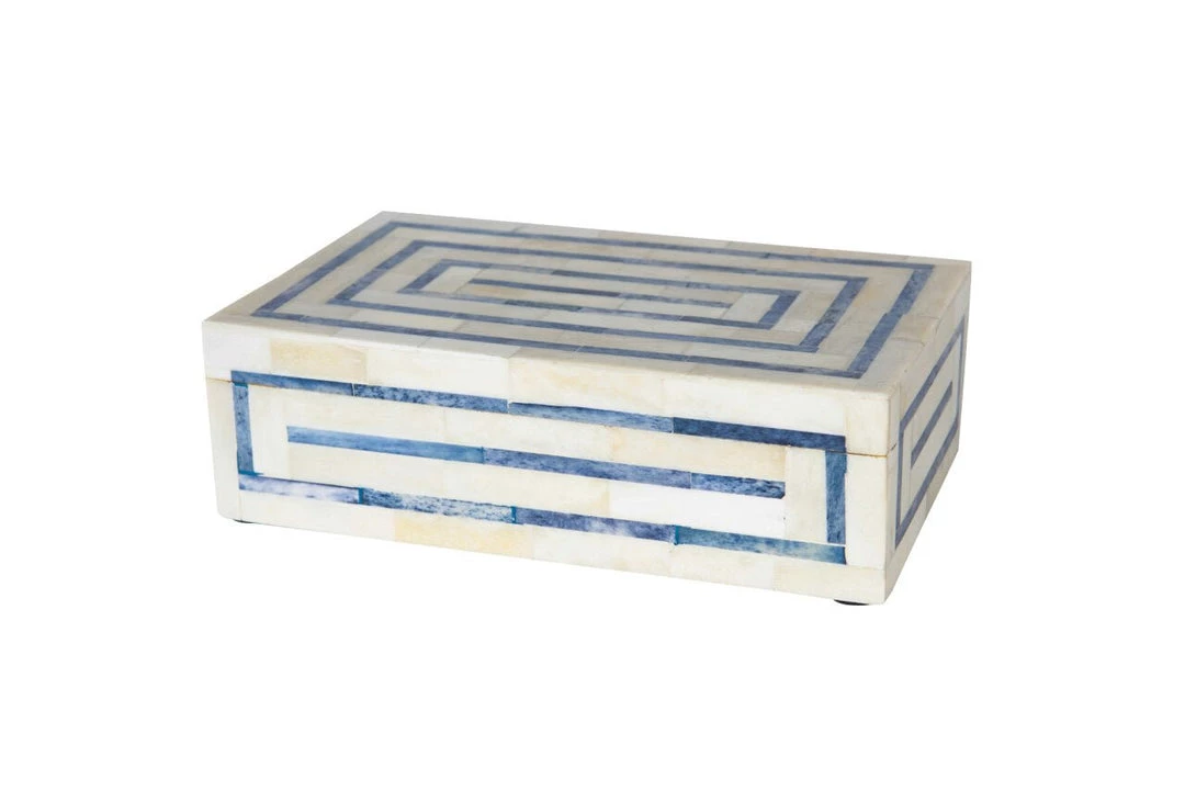 This blue and white square lined bone box is beautifully decorative and functional. Revamp any coffee table or bookshelf with this handmade and handcrafted, all natural bone inlay and horn box. Stack multiple sizes together for an added layer of beauty.