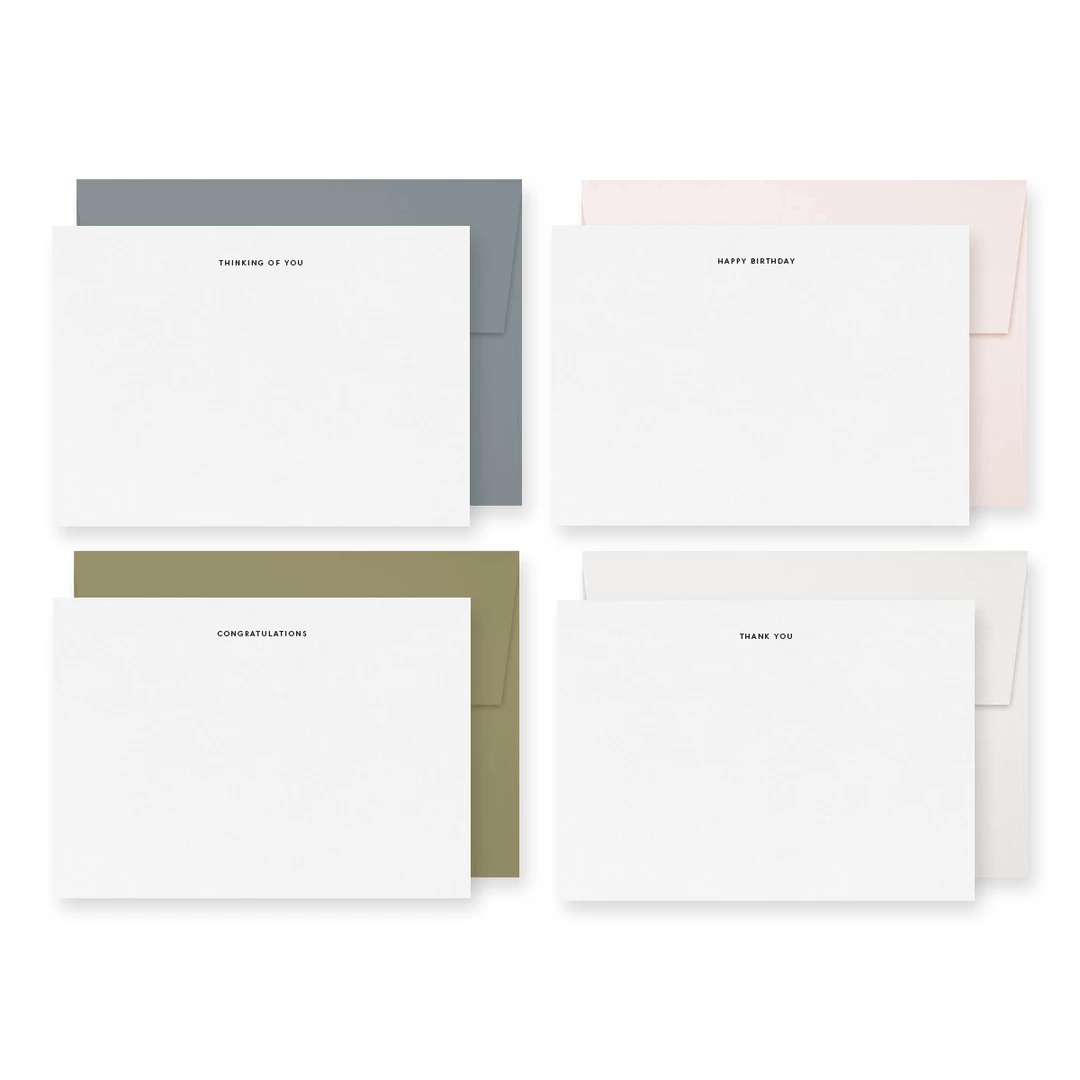 Mix and match these elegant & understated flat notes with envelopes in four fresh new colorways. Set of 8 flat cards & envelopes, foil printed on the softest 100% cotton paper.