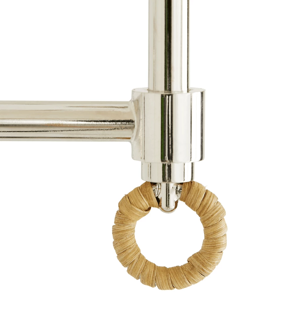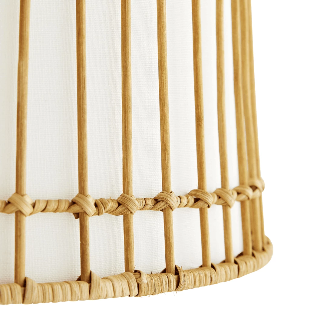 Recalling the humble yet complex architecture of a wicker basket the sea island floor lamp has a rattan structure and an ivory linen-wrapped interior. It perches like a birdcage on top of a polished nickel pole with swivel top offering warm layered light the horizontal and vertical lines creating subtle pattern play.Â