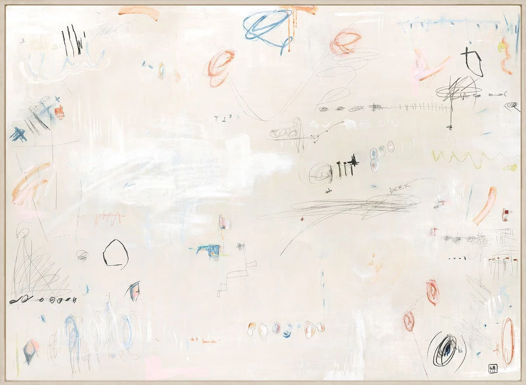 An assortment of lively marks scattered across a textured neutral ground. The viewer will find a wealth of interest with so many energetic lines and sweet colors. Finished in a natural wood floater frame.