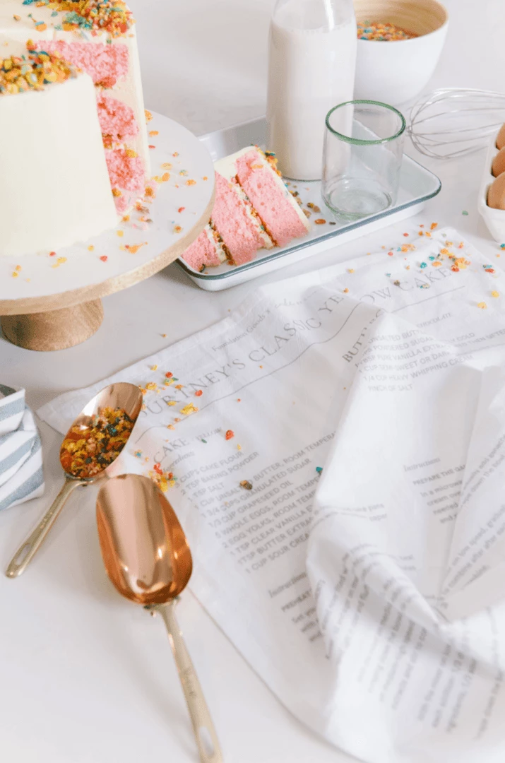 Featuring Cake by Courtney’s very own Yellow Cake and Buttercream Frosting recipes, keep this dishtowel close at hand while baking.Â
