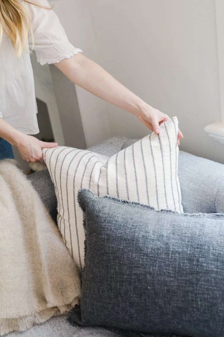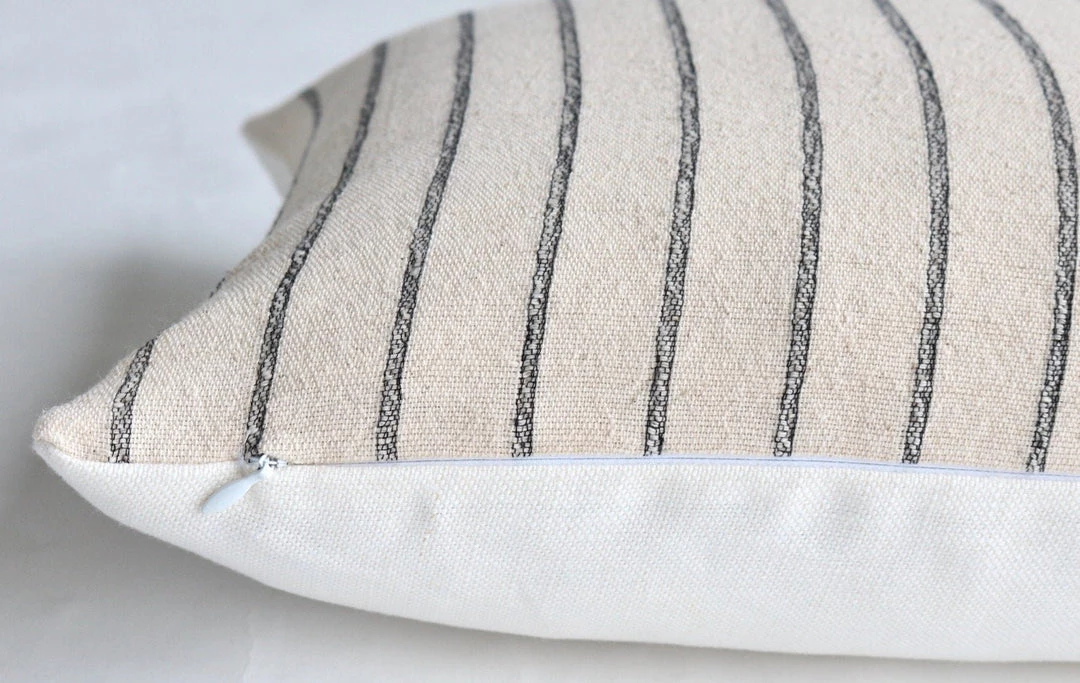 This pillow is a black woven stripe on cream cotton background with 100% off-white heavy weight linen back. Invisible zipper with serged edges included.Â