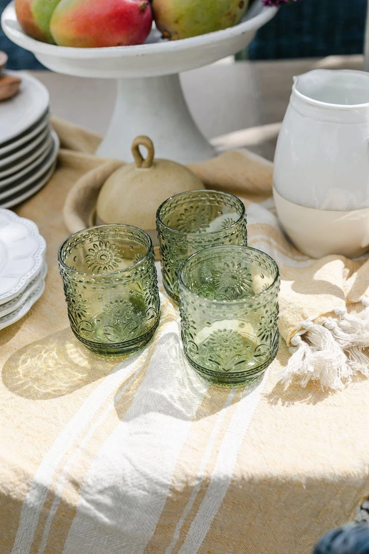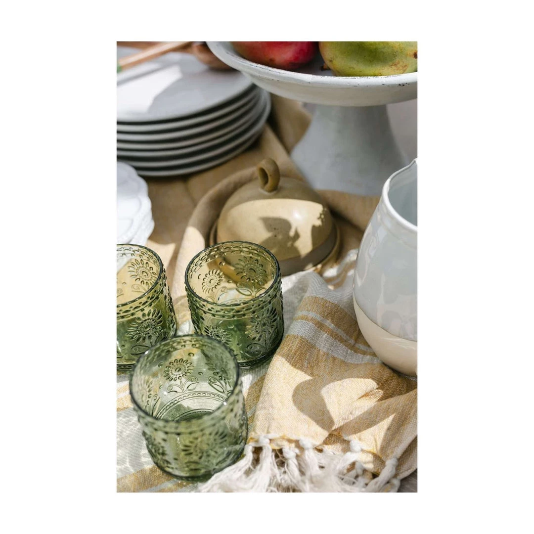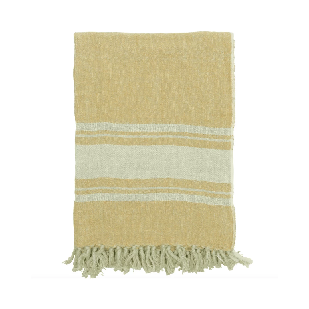 The soft, heavy linen inlay border throw features a thicker natural stripe alongside a solid color base with tassels all along the edge.