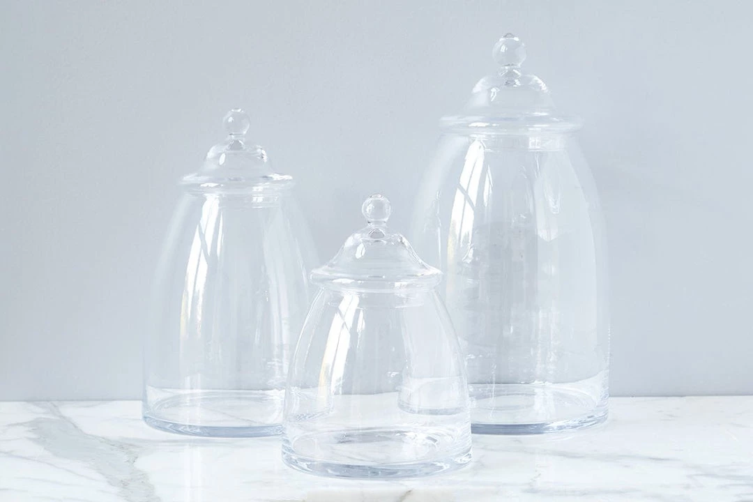 The glass bon bon jars are the perfect vessel to display candy, fruit and snacks. A key element for storage and organization, each jar is adorned with its own unique top. a