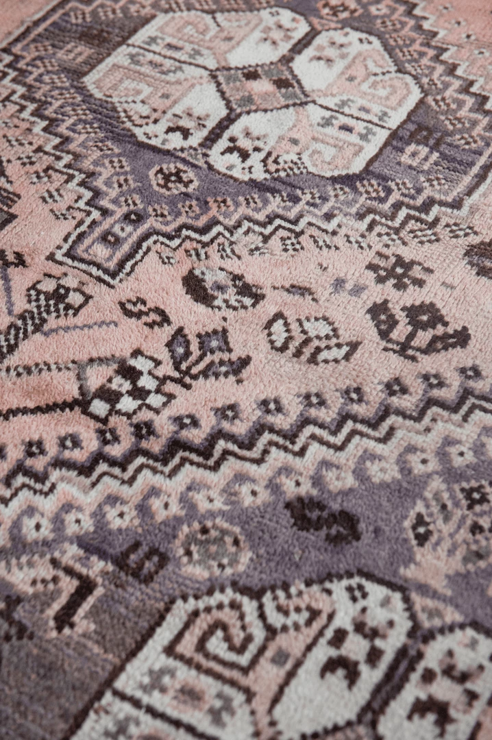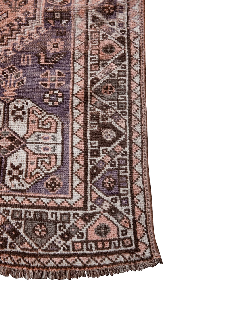 The Kelsey features intricate patterns in faded red, brown and purple tones to create a completely unique look. Wear, pattern and color variation is expected with vintage rugs and adds to the character of each one-of-a-kind piece.Â