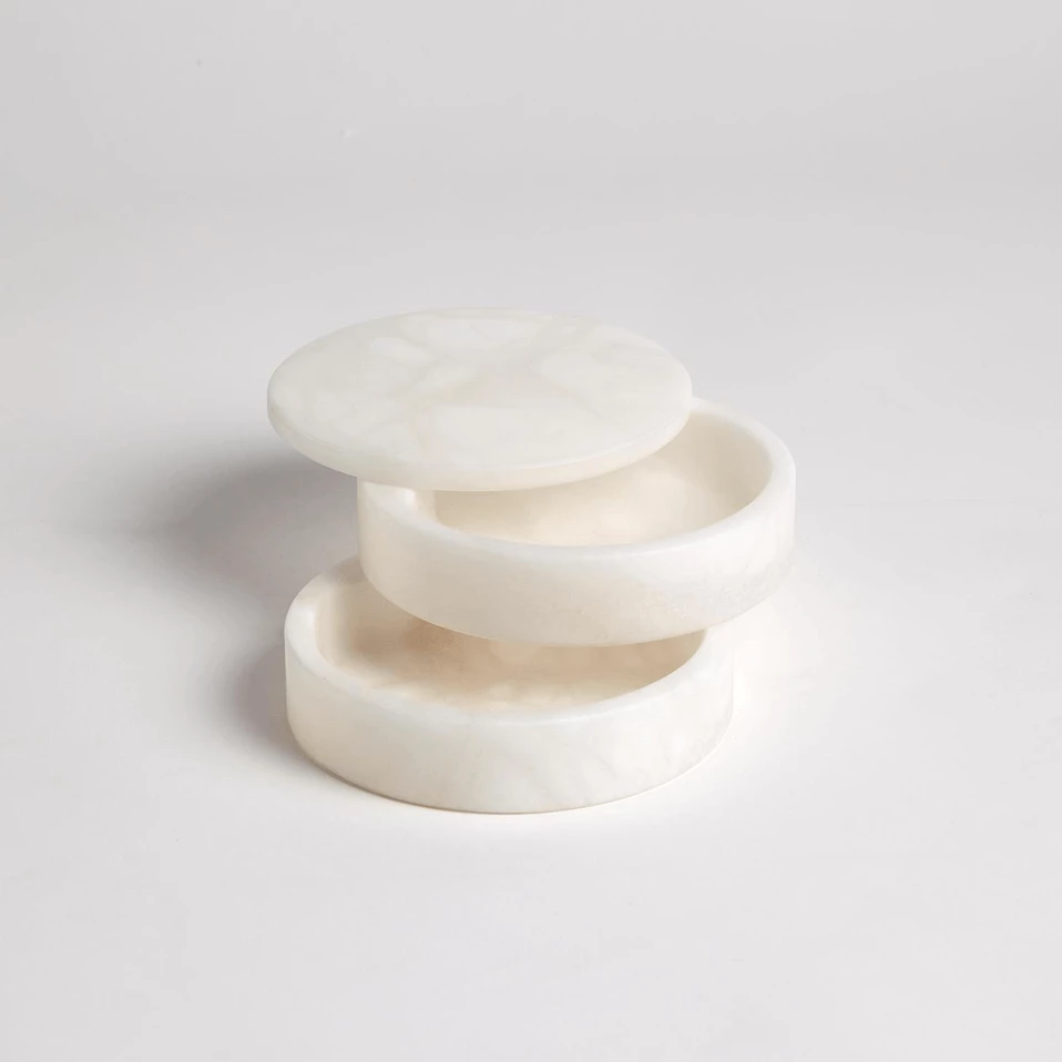 Our Alabaster Swivel Box is made by a family who has been working in alabaster for centuries. This functional box features two unique compartments. As alabaster is a natural product, please be aware that there will always be variations in veining and color. This is to be expected and makes every alabaster product uniquely your own.