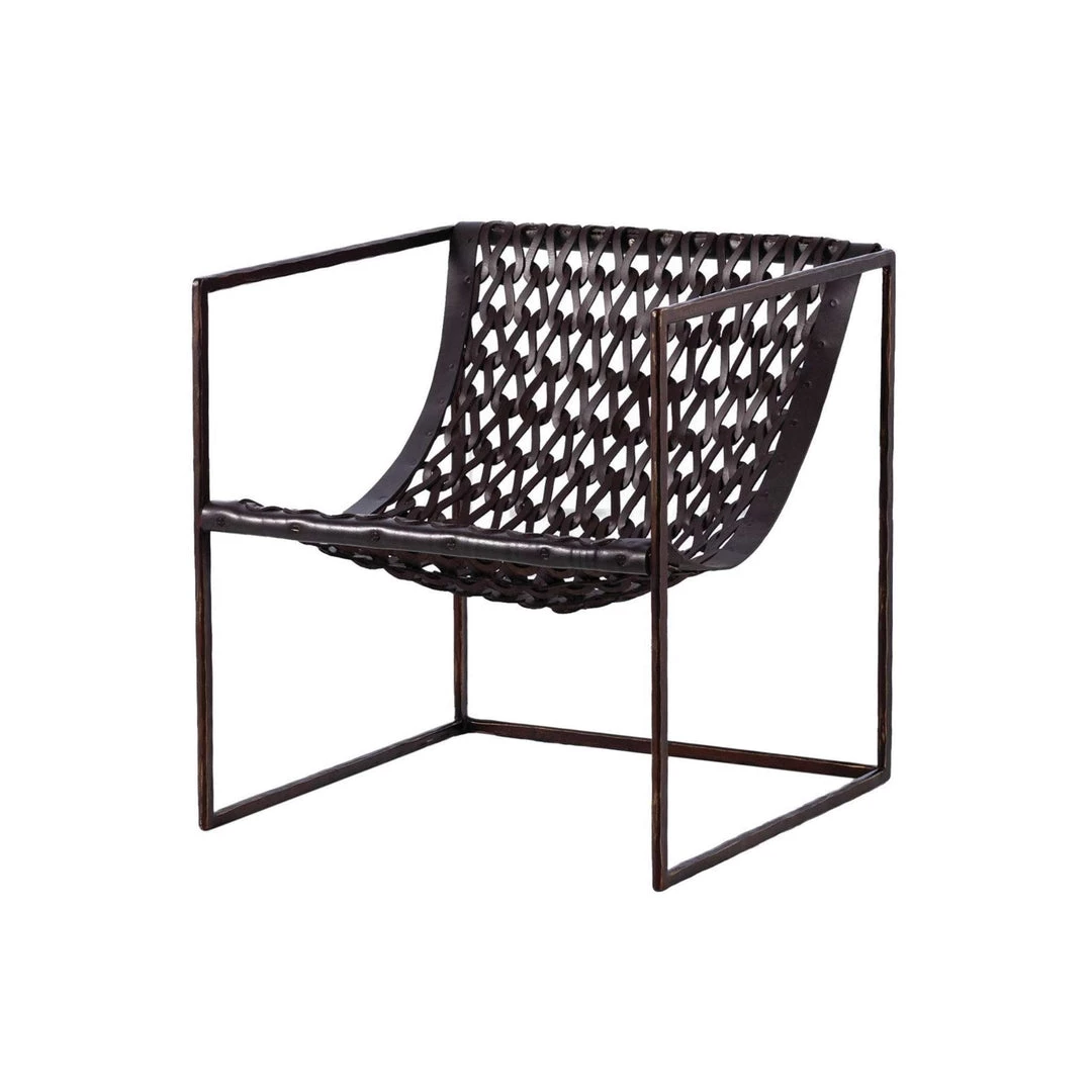 Luxurious leather and bronze finished iron join forces in this stunning chair. The intricate hand weaved pattern of the leather adds dimensionality to this statement piece.