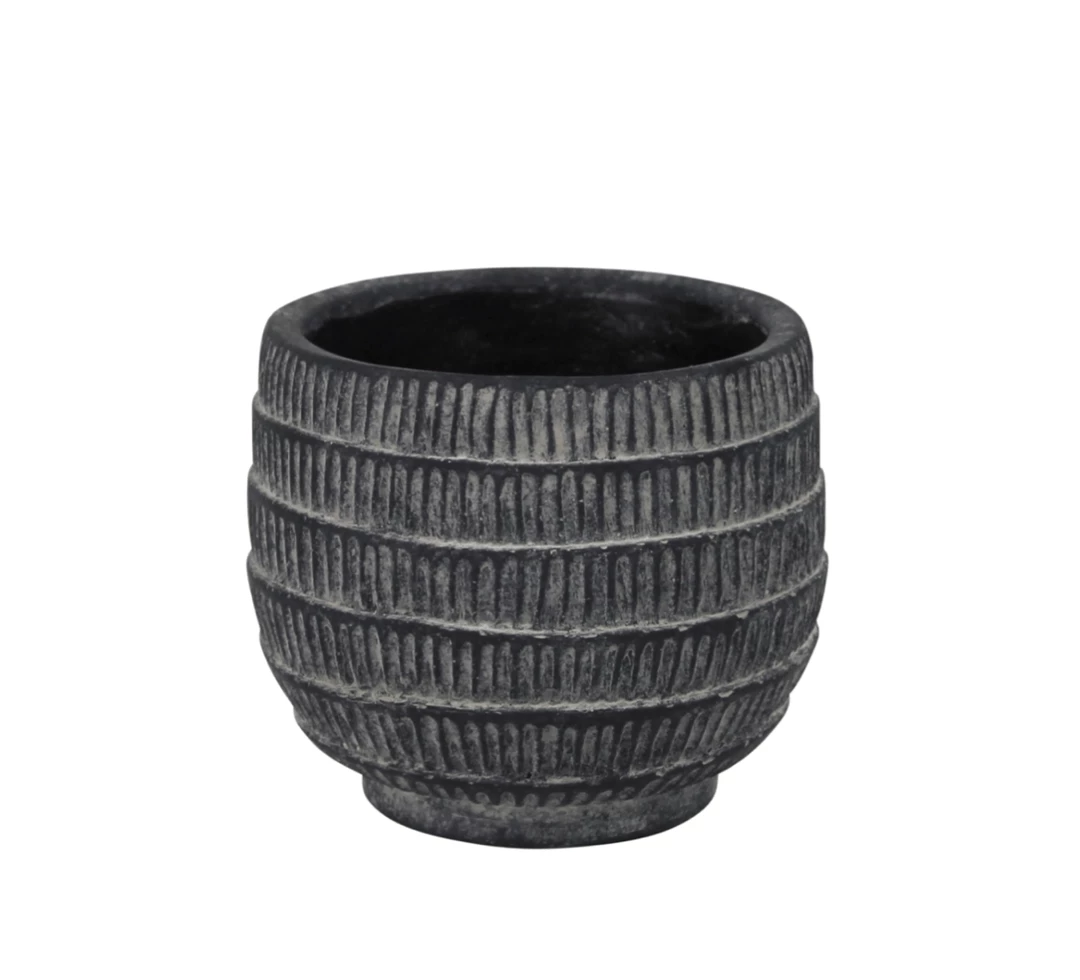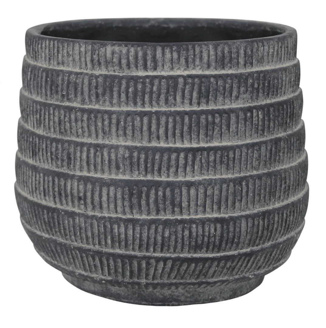 Constructed from sturdy cast cement with a ridged texture and soft patina finish this cachepot brings a rustic nod to garden decor. Watertight.