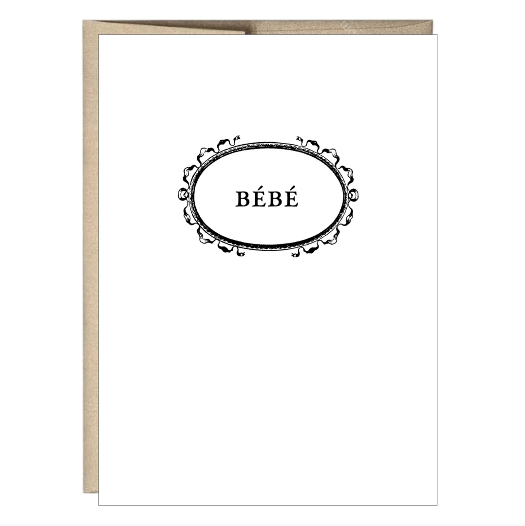 Looking for a chic, traditional card to welcome or introduce the new baby in your life? Our beautiful French Bébé Baby Letterpress Greeting Card is a sweet and special way to share your big announcement or congratulations. The front of this card features a ribbon-style frame around the word Bébé, French for baby. Each card is printed in classic black ink on white cotton stock. Plus, we letterpress print by hand on our vintage Chandler & Price letterpress, Hazel, so each card has a unique one-of-a-kind look and feel.