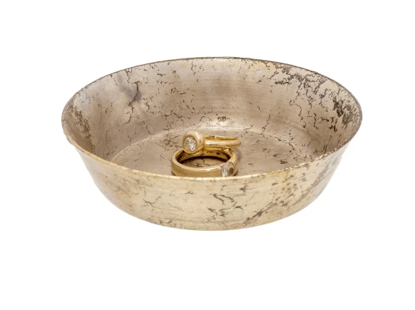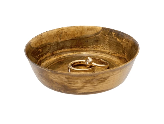 This catch-all’s subtle patina lends a vintage appeal to any decor in brass or silver.Â