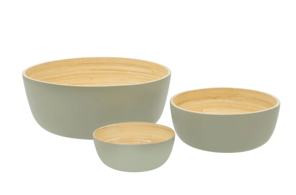 Spun bamboo bowls finished with a hazy hue in three nesting sizes hold kitchen essentials.