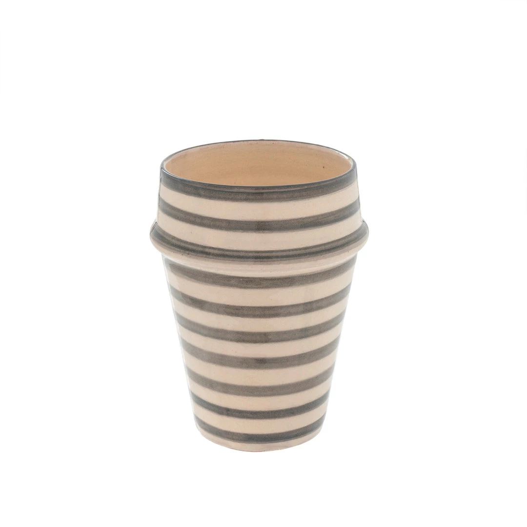 Made of clay and hand-painted, this light grey striped cup is both pretty and purposeful in design.Â