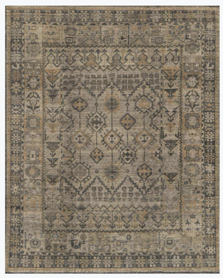 A unique blend of traditional motifs, this hand knotted rug brings together a blend of neutral tones with just enough color to brighten and ground any space.