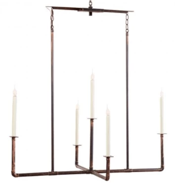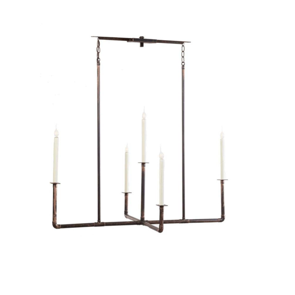The vintage long bar chandelier with cross-section adds another option to the beautiful copper long bar with staggered arms. Custom heights available. Contact for customization.