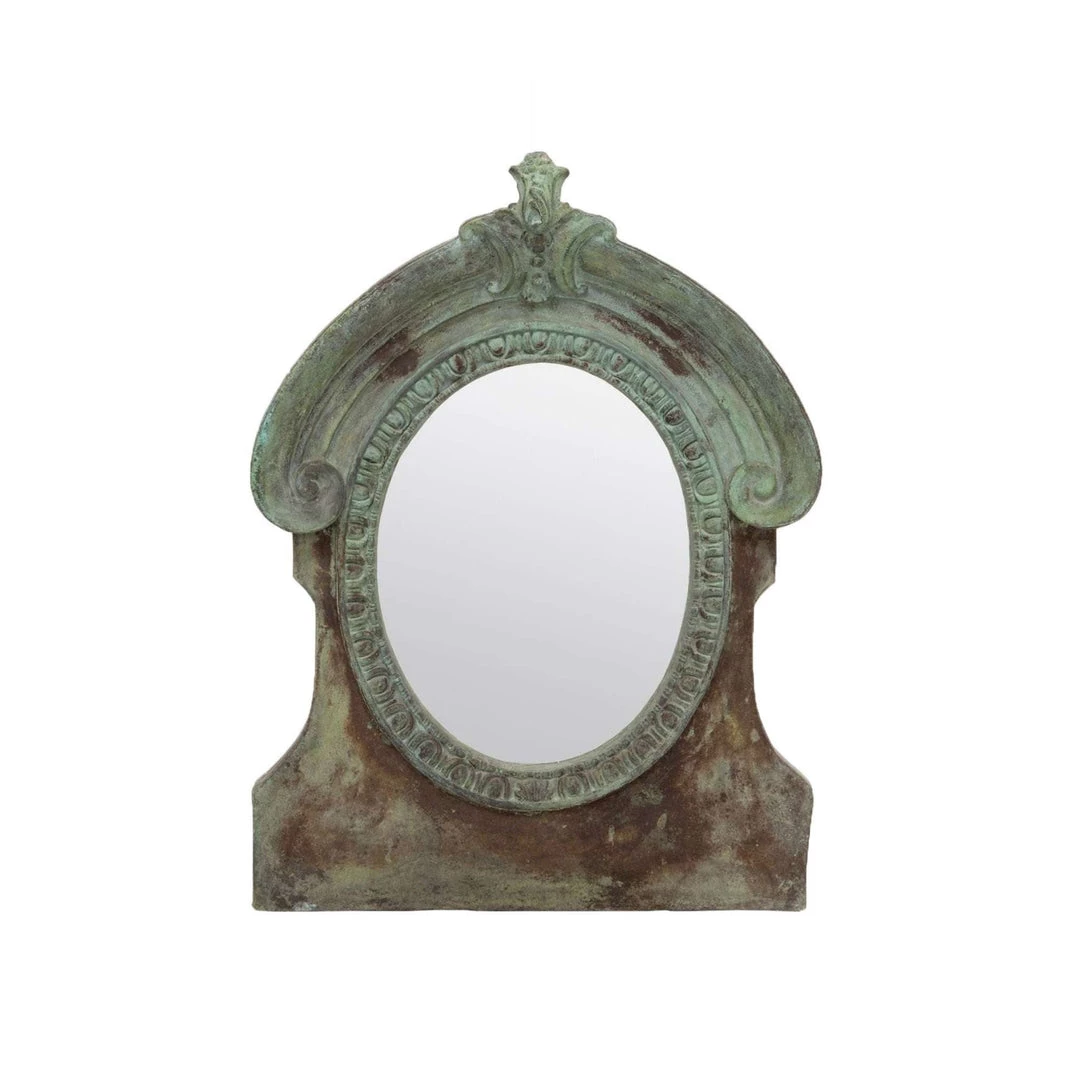 The sophisticated French shape of this piece is made of concrete. Use it outdoors or inside for a casually classic touch. This mirror has a thick frame with an approximate 5” depth. Concrete material naturally distresses. Minor cracks and imperfections are to be expected.