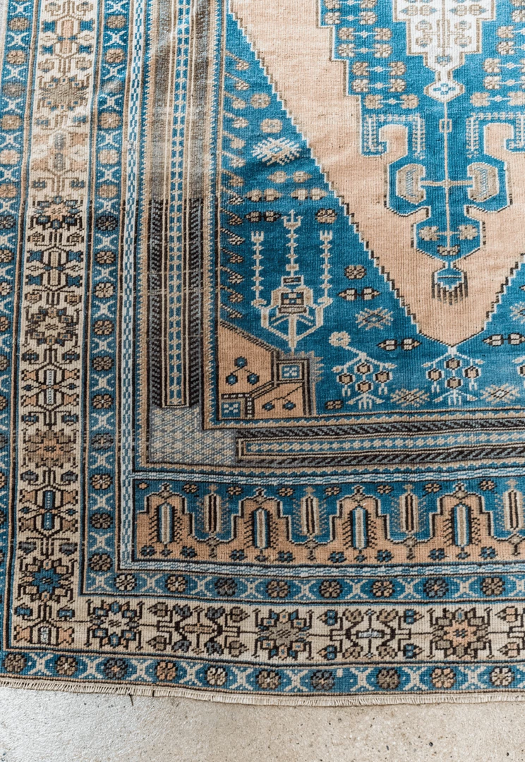 The Lauren features intricate patterns in peach and aqua tones to create a completely unique look. Wear, pattern and color variation is expected with vintage rugs and adds to the character of each one-of-a-kind piece.Â