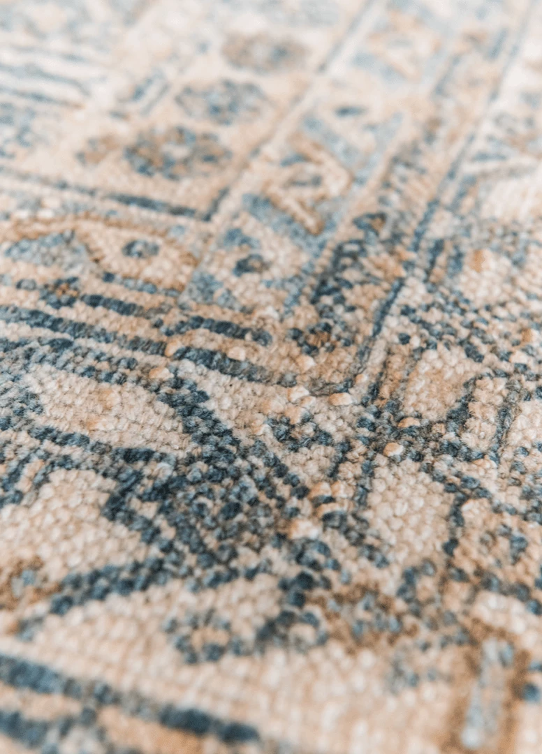 The Olivia features intricate patterns in cream, peach and blue tones to create a completely unique look. Wear, pattern and color variation is expected with vintage rugs and adds to the character of each one-of-a-kind piece.Â