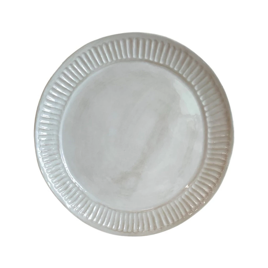 Organically shaped and made of a warm creamy white, this was designed for the Farmhouse kitchen. The hand-applied imperfect ridges add even more character.Â