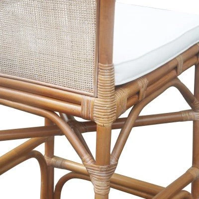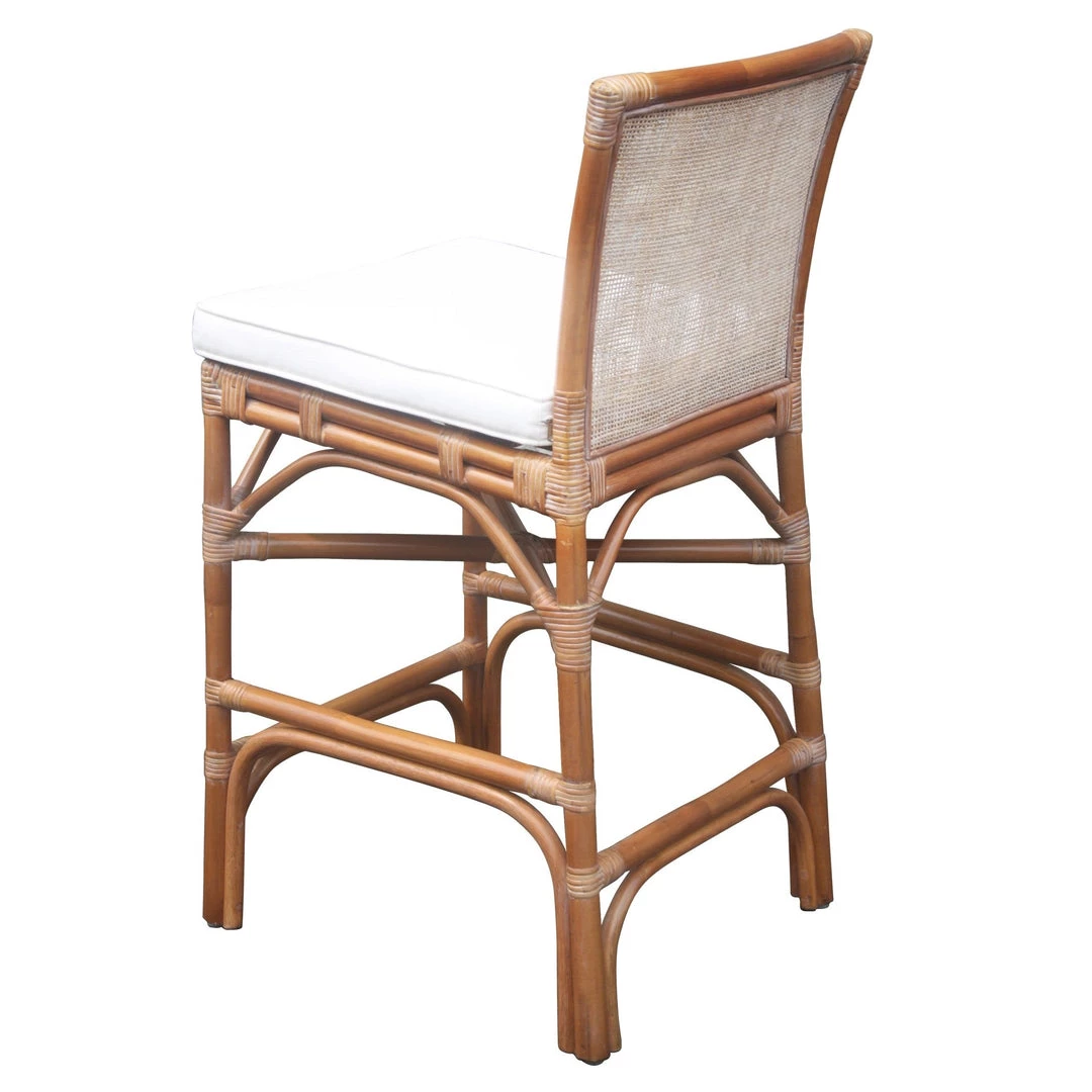 This rattan counter stool features wrapped joinery and an airy cane back. It’s a lightweight design that stands up to everyday indoor use. The seat cushion is removable. Fully Assembled, available in Canary Brown.