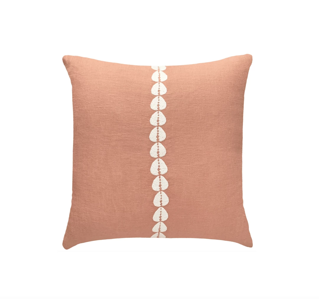 A simple chain of embroidered cowrie shells adorn this natural beauty making it feel right at home but still calling for the bohemian traveler in you. Lightweight with a soft and smooth hand-feel. Our signature red invisible zipper at the center bottom allows you to remove inserts for easy care.