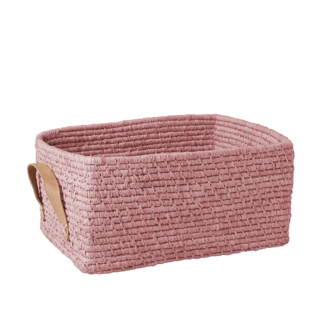 These natural fiber baskets are durable yet malleable. Raffia holds this soft pink dye wonderfully and two leather handles add convenience without sacrificing style.