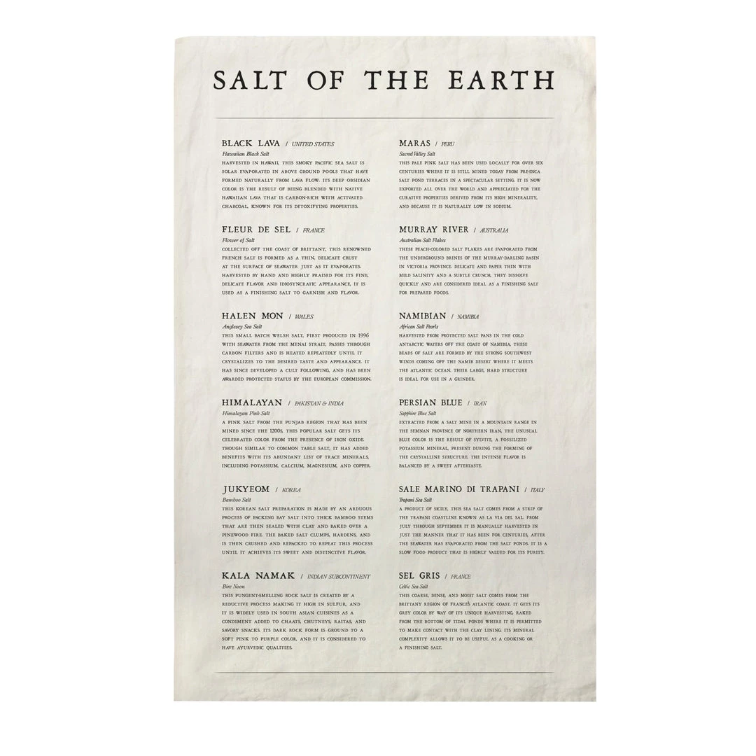 Our Salt of the Earth Tea towel highlights some of the world’s most unique salt styles. Inspired by traditional English tea towels, made from pure linen to avoid surface lint when drying delicate china and glassware each towel is printed using silk screens and cut from running yardage that comes off the loom with selvage sides before we hem it by hand.
