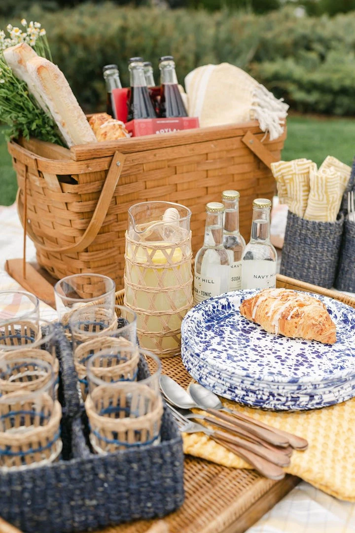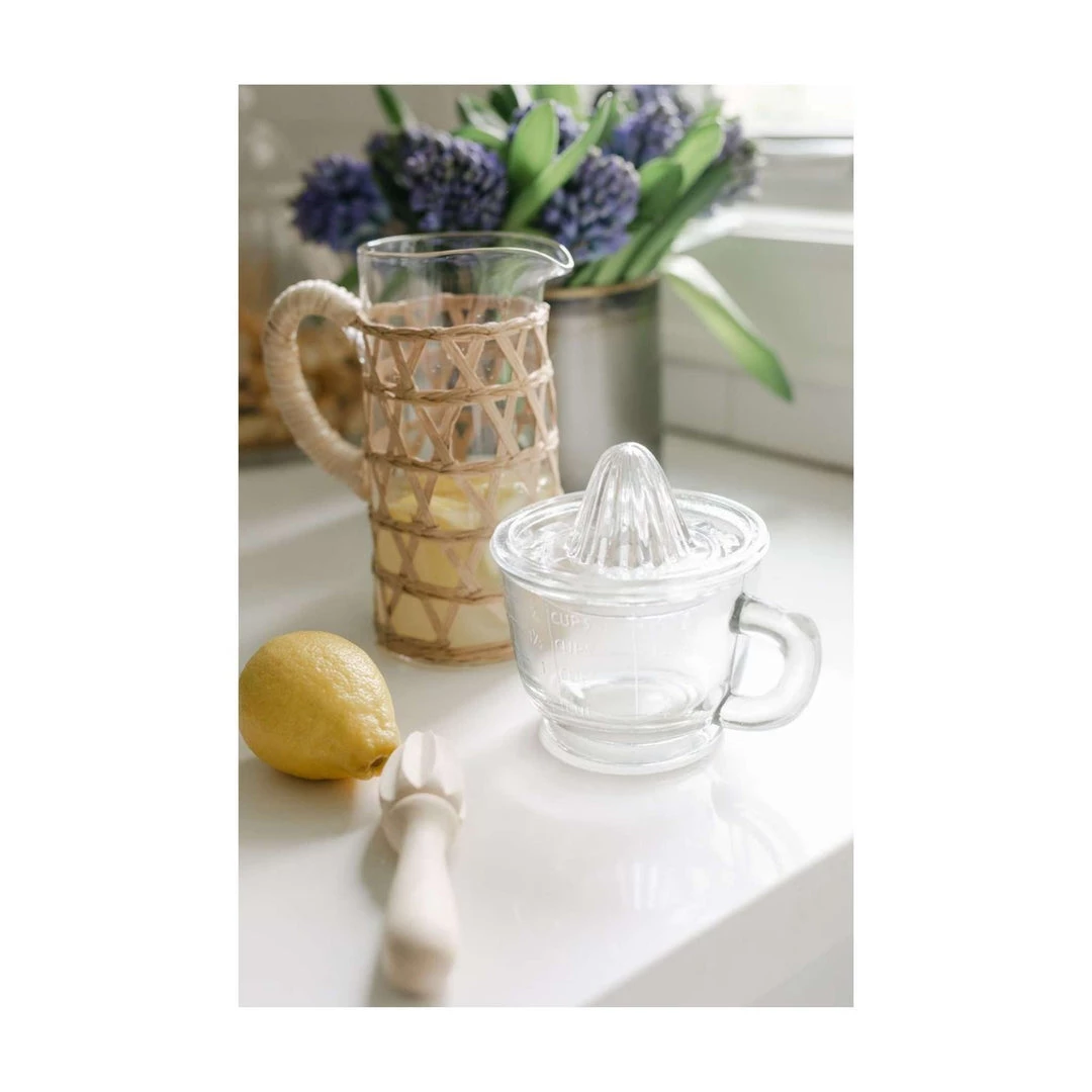 This stunning hand blown glass pitcher is wrapped in paper twine giving it a unique and chic look.