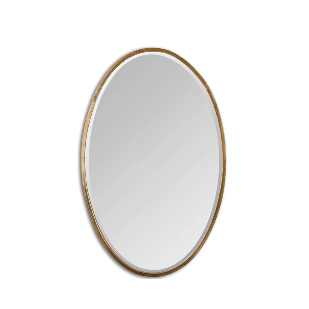 Narrow, hand forged metal frame finished in heavily antiqued, plated gold. Mirror is beveled and may be hung horizontal or vertical.