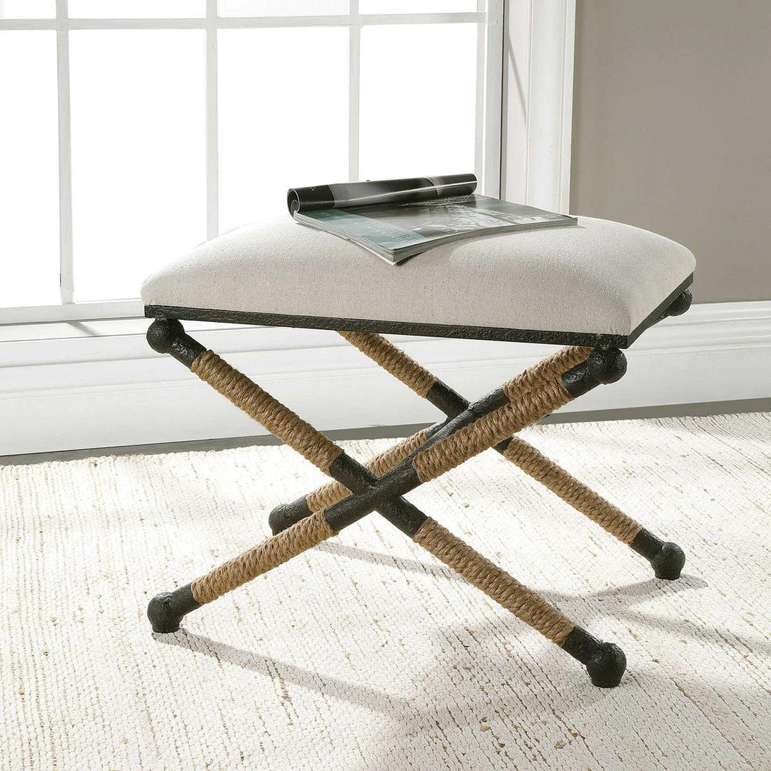 Rustic iron frame with a nautical touch, wrapped in natural fiber rope accents. Cushioned top is a sturdy, cotton in a neutral oatmeal.