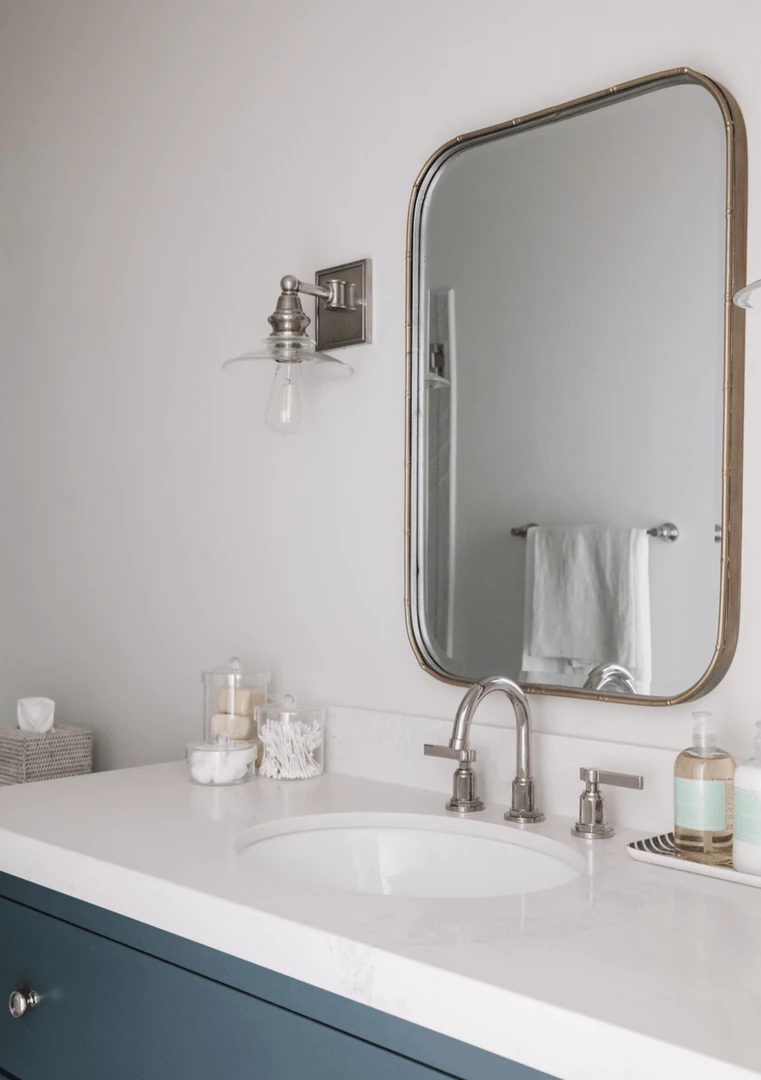 A nod to classic Chinoiserie style, this vanity mirror has a petite iron frame with a bamboo design finished in antique gold leaf. May be hung horizontal or vertical.