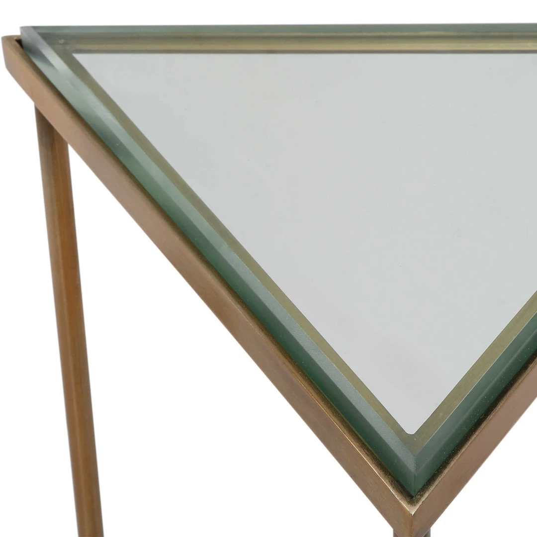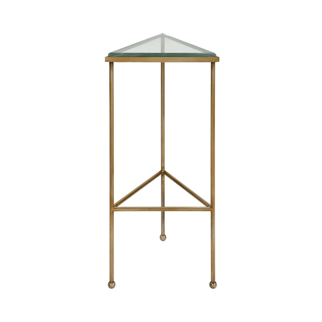 This quirky triangular drink table features a sturdy iron frame, finished in a sophisticated brushed gold with a thick glass top. Perfect for displaying a cocktail or your favorite book.